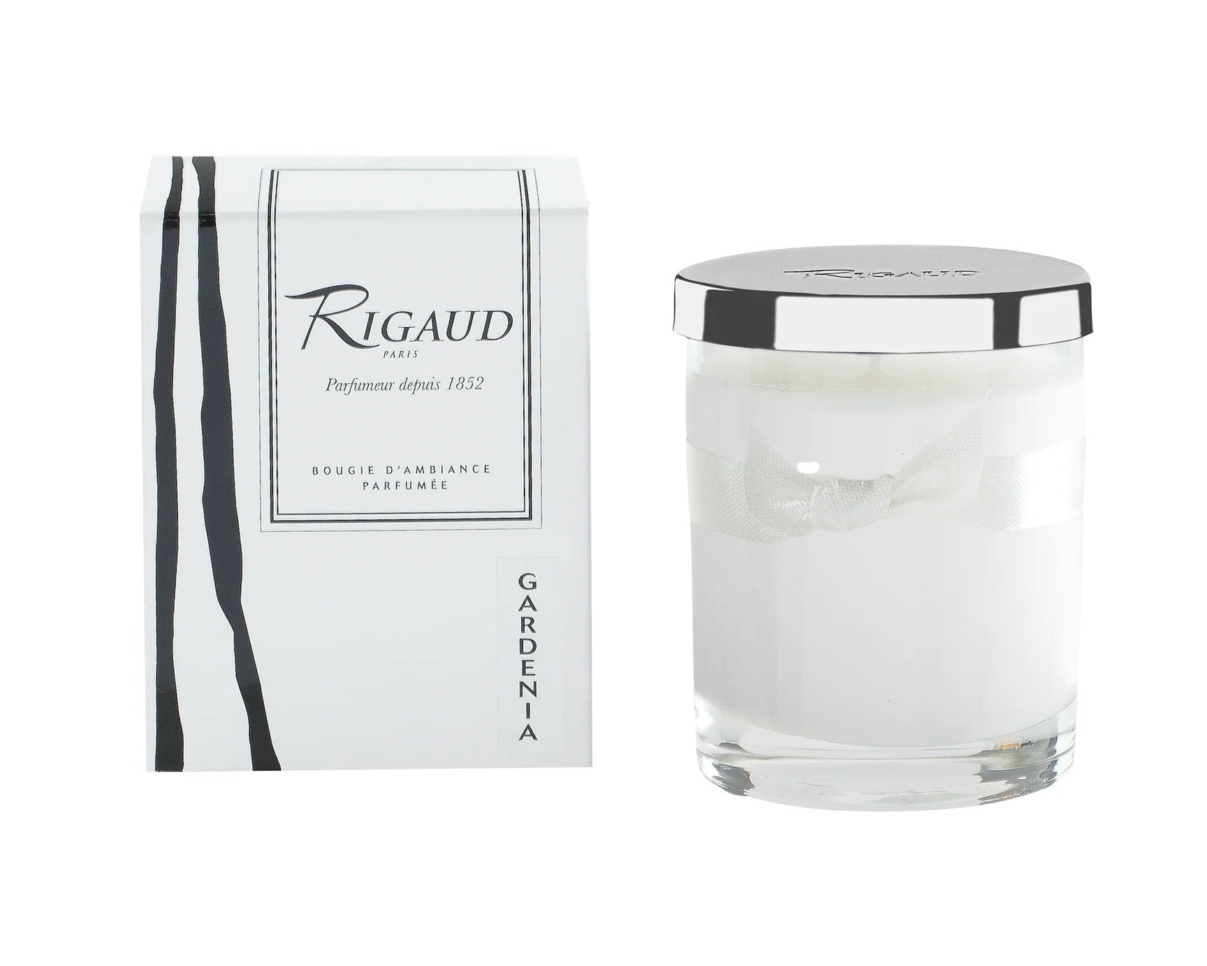Rigaud scented candles are presented in a thick glass container, decorated with a hand-tied embossed satin ribbon, and a silver-metal snuffer cap