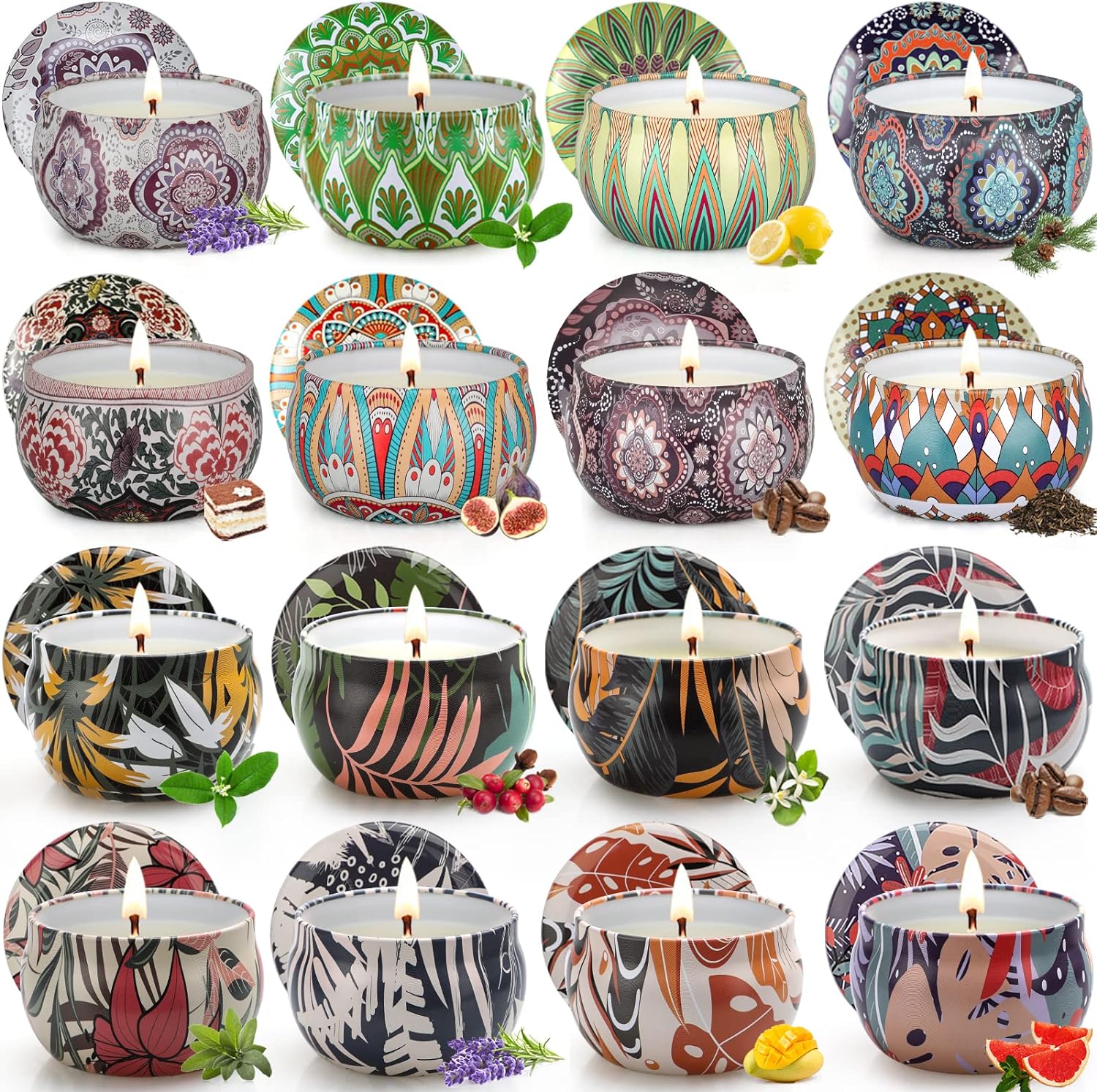 【16 Fragrances】: Lavender, Mango, Sage, Green Tea, Lilac, Mexican Neroli, Grape, Coffee, Fig, Lemon, Osmanthus Fragrans, Cream, Pinus Banksiana, Whisky, Oolong Tea, Marshmallow. The candles for home scented measure 2.5*1.8 IN, are beautifully packaged, and are easy to carry. 16 candles weigh 40 OZ and can burn for about 320 hours.