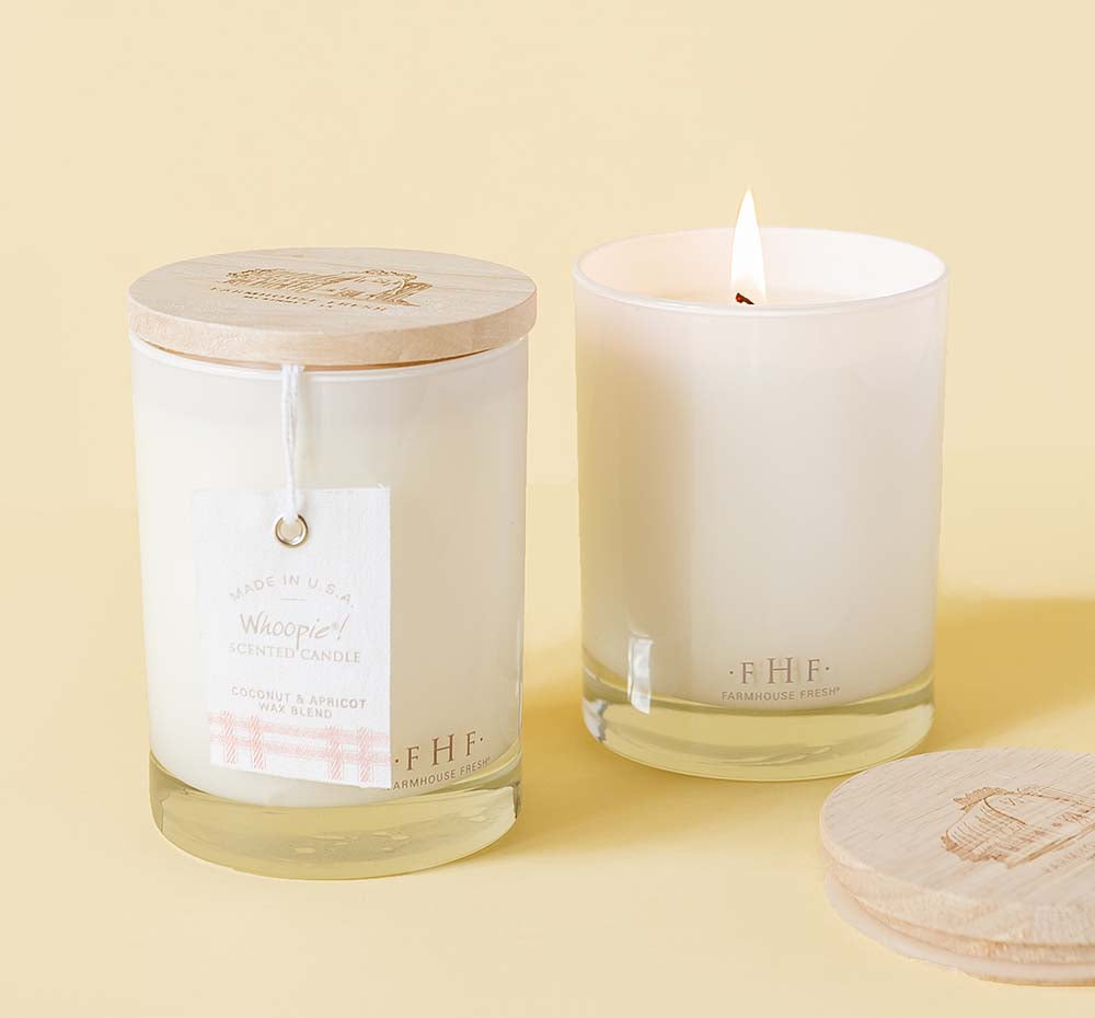 Bring the scents of The Farm to life with our collection of epicurean candles. Like a fresh baked Whoopie Pie out of the oven, your favorite FHF scent is ready to illuminate your space with delicious notes of white velvet buttercream – the quintessential dessert for all soirees and now your nightstand!Made with a coconut & apricot wax blend, each candle is clean-burning, hand-poured in Texas, and boasts a 60 hour burn time. To add a southern artisan flair, each wooden lid is branded with our FarmHouse Fresh® insignia, so you know it’s authentic from us to you.